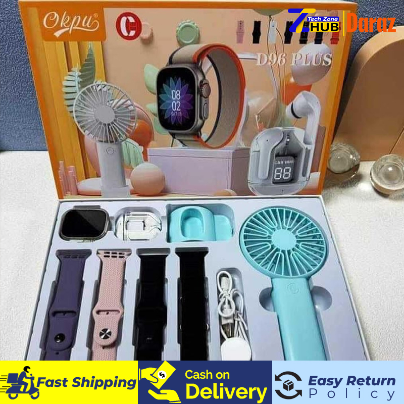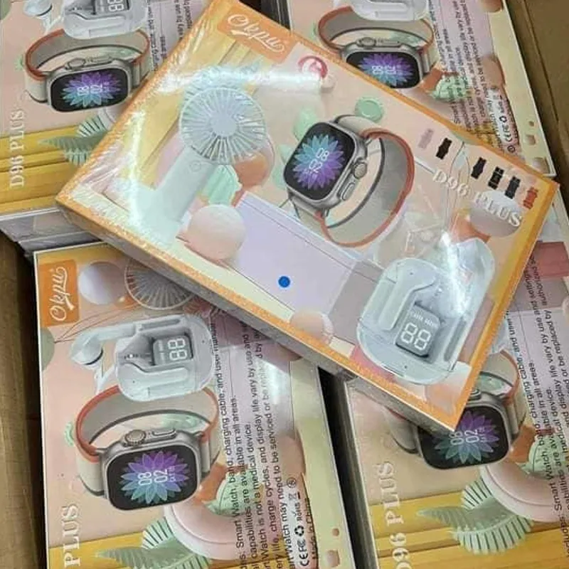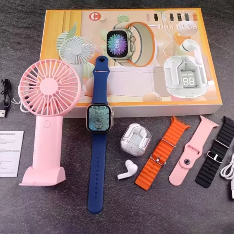 - Combo Pack: D96 Smart Watch, Portable Fan, Earbuds